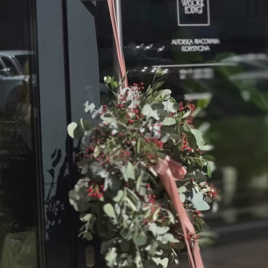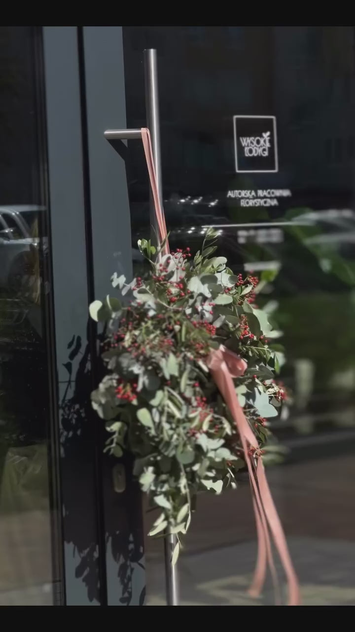 Wianek został wykonany z drobnych gałązek dzikiej róży, eukaliptusa oraz oliwki.